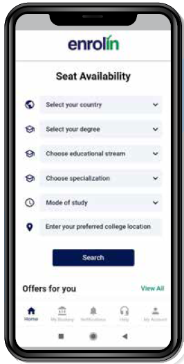 Booking a seat in Enrolin is easy. On your mobile Enrolin app, on home page, select your country, degree, educational stream, mode of study and preferred college location. Click search and voila! You have a list of colleges that you can browse through and select from. Enrolin app also offers personalized offers.